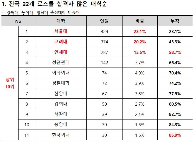 1위 서울대 429명(23.1%), 2위 고려대 374명(20.2%), 3위 연세대 287명(15.5%) 순
