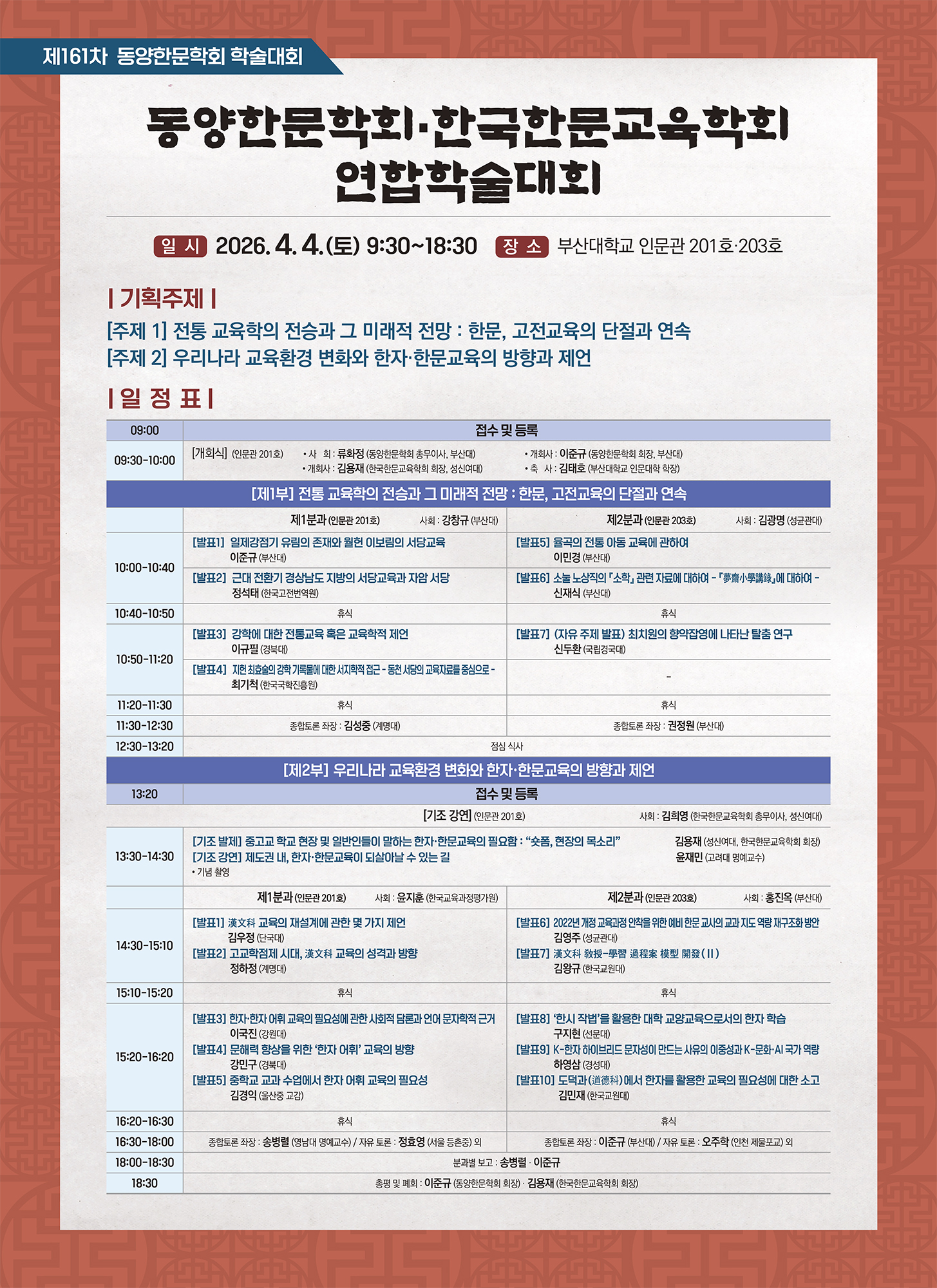 동양한문학회는 한국한문교육학회와 공동으로 오는 4월 4일 오전 9시 30분부터 부산대 인문관(201호, 203호)에서 ‘연합학술대회’를 개최한다.